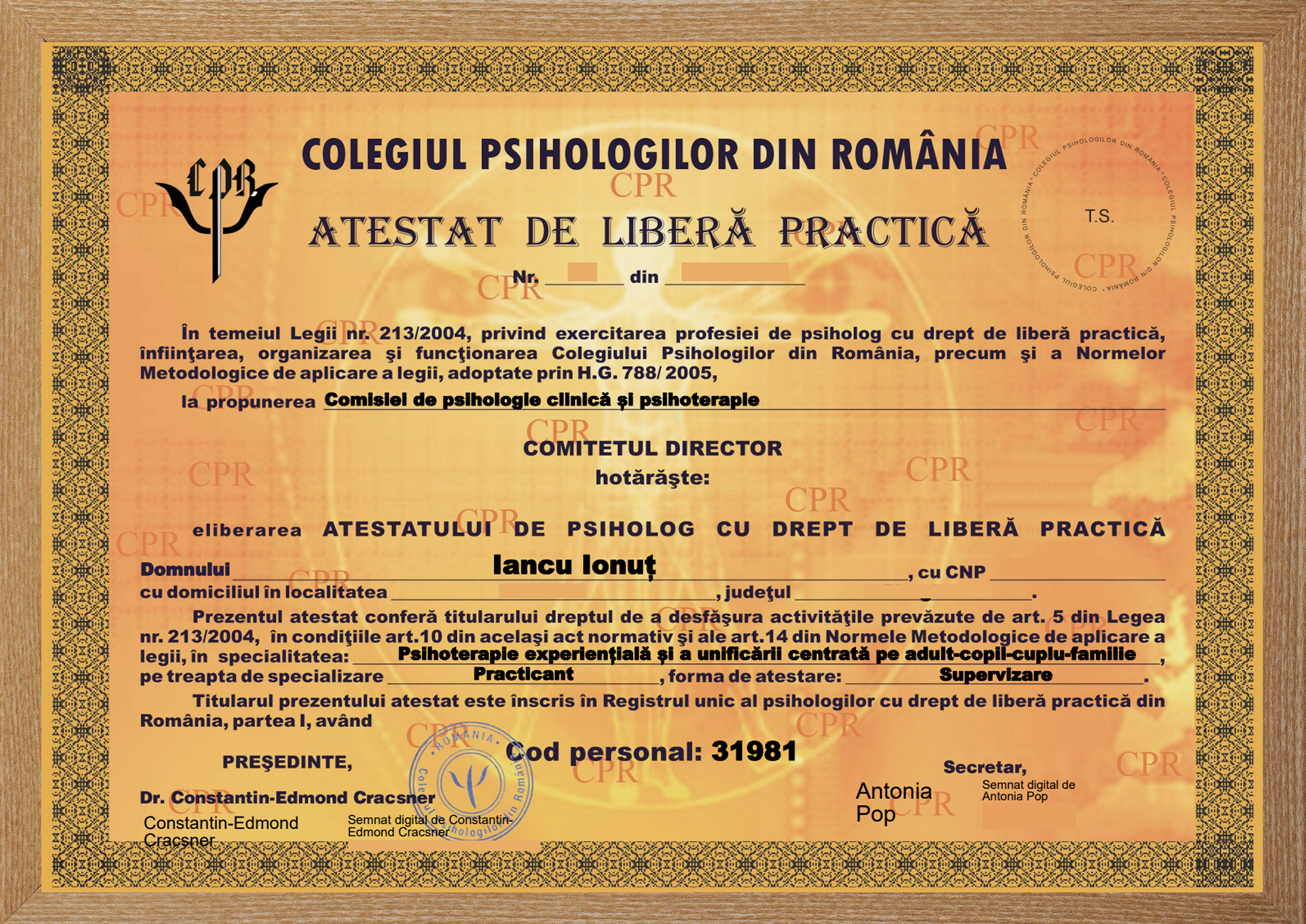 Psihoterapeut cu drept de liberă practică - Colegiul Psihologilor din România. Vezi ATESTAT